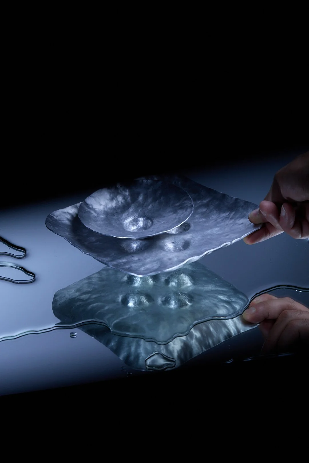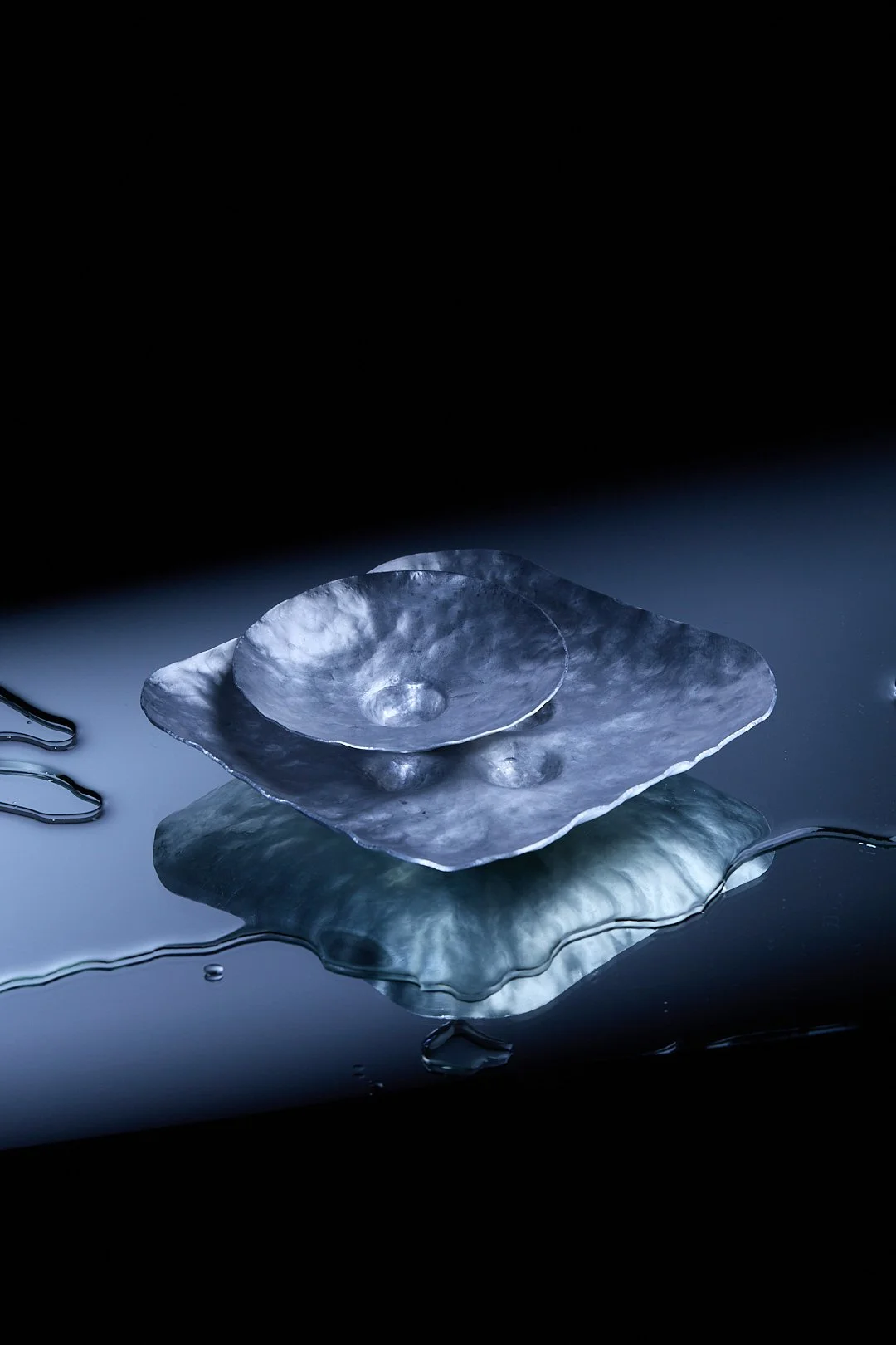 Dado, is hammered low bowl that explores repoussé to play with functionality and expressive form to recreate the face of a dice.